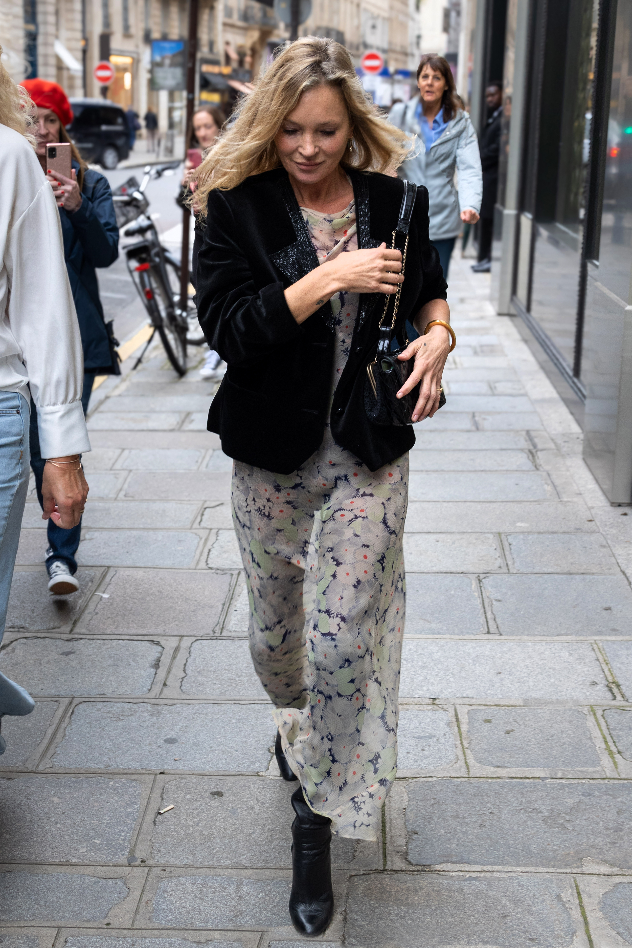 Though their velvet garments were very different, the mother-and-daughter duo let their personal styles shine through. Lila took a moodier approach to her outfit, pairing her velvet trousers with a leather jacket, black almond-toe boots, and a suede bag. By styling her velvet trousers with other heavy fabrics like suede and leather, Lila brought out the plush and lavish energy of the fabric, creating a rich-looking outfit that could see her well into the winter months. Taking a lighter approach to her velvet styling, Kate paired her velvet jacket with a sheer floral dress in a light, fresh color palette.